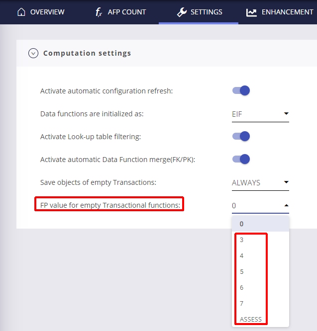 - And either one of the following depending in the value chosen for the FP value for empty Transactional functions setting/