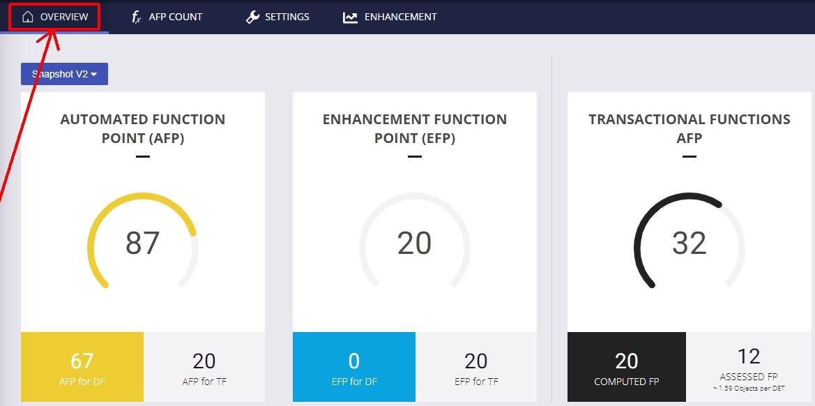 The Overview page shows general information about the function points in your application: