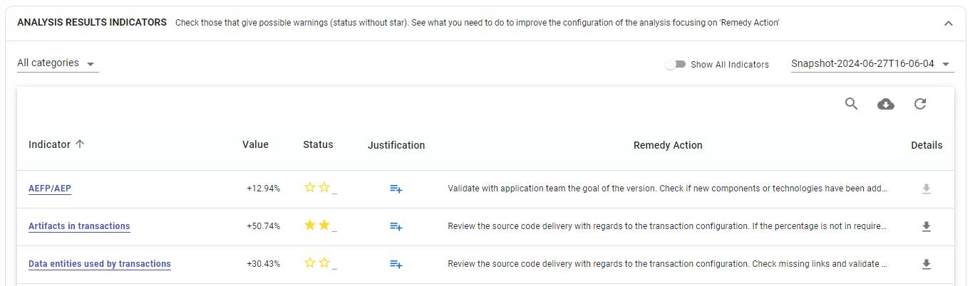 | Requires snapshot or analysis? | Indicator Name | Description | Stars/Threshold | Details in CSV file | Remedy Action |