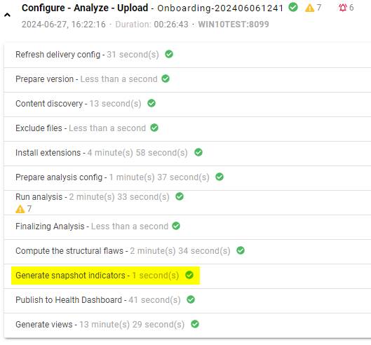 This section displays a set of indicators for a given analysis/snapshot. These indicators are designed to provide basic information quickly so that the analysis/snapshot can be validated. The indicators are generated during the analysis/snapshot in a dedicated step and can be generated on-demand manually (see below):