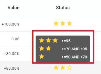 Status of the indicator - the more stars the better the results. Rolling the mouse over the stars will show the thresholds required to improve: