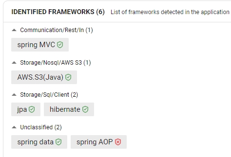The Identified Frameworks section lists all the frameworks that have been detected by Console during the fast scan phase. The icon depicts how the identified framework will be analyzed, using the same legend as in the Software Composition section: