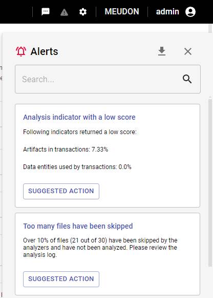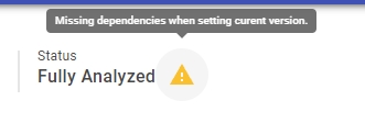 - Deep analysis done > The source code has been analyzed and results are ready. Note that if any missing dependencies are detected in your source code during the analysis (i.e. code that is calling another piece of code that cannot be found) a warning icon will be displayed. This should be fully investigated and corrected because it means that results may not be coherent. Clicking the warning triangle will direct you straight to the log file to see the missing dependencies alerts: