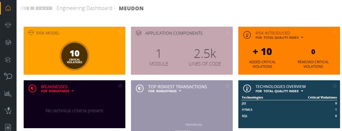 Launches the Engineering Dashboard (available with appropriate CAST licenses only) allowing you to investigate the application from a quality perspective (based on the results of rules triggered during the analysis):