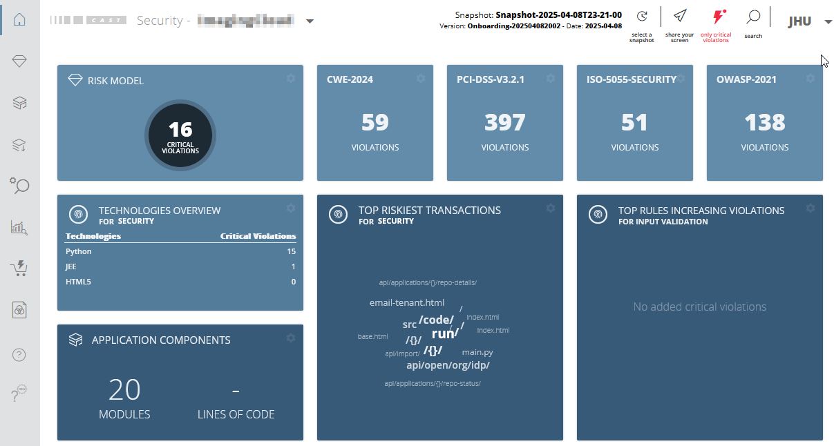 Launches the Security Dashboard (available with appropriate CAST licenses only) designed to help organizations better understand and improve the safety and soundness of business-critical software. The CAST Security Dashboard goes beyond code-level checks, providing Software Intelligence that helps teams: