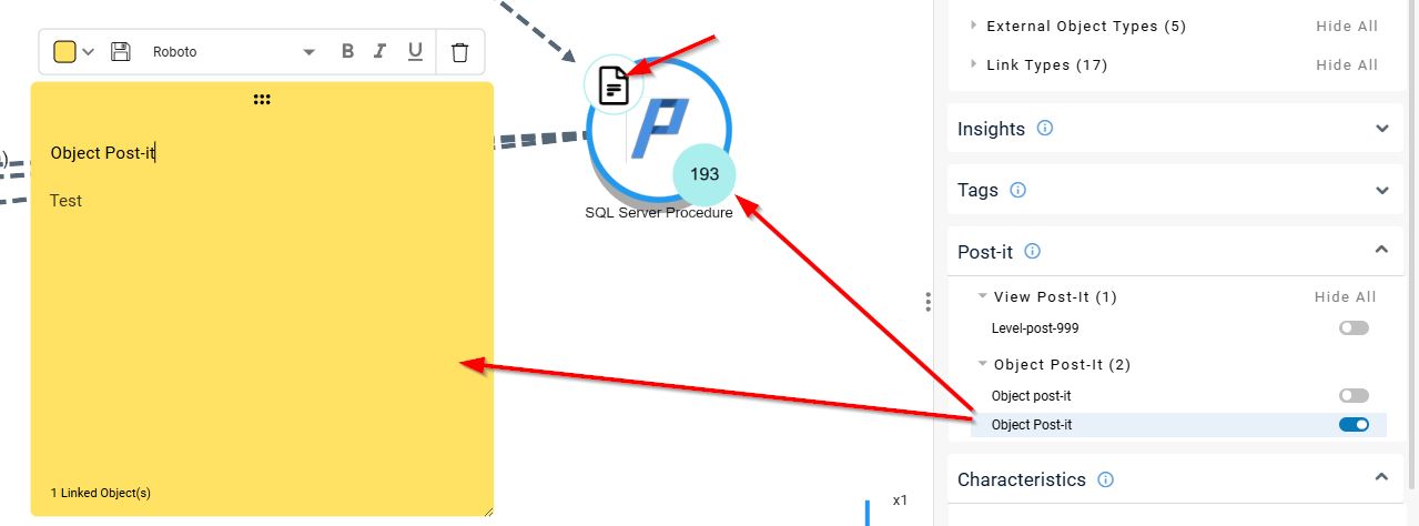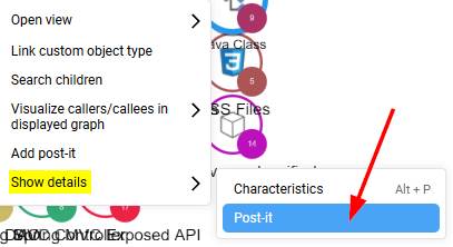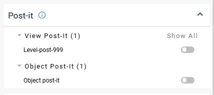 Displays a list of Post-Its attached to the view itself, or to one or multiple objects/nodes visible in the current view. Clicking them will display the corresponding Post-It: