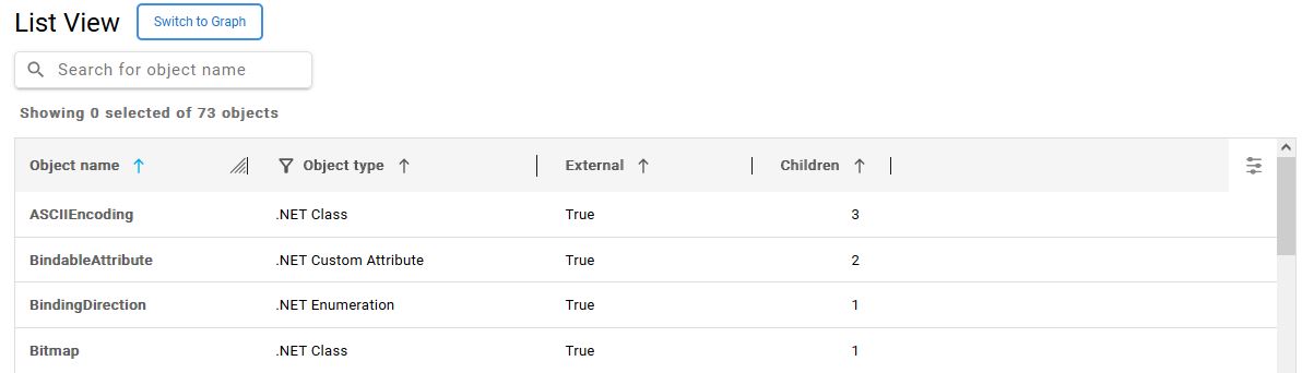 Displaying the items in list form allows you to see more easily the items in your application, any children they may have and whether they are considered external (i.e. originating in third-party components):