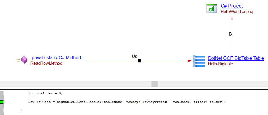 The analysis of the following source code will create a Dotnet GCP Bigtable Table object named Hello-Bigtable with a useSelectLink.