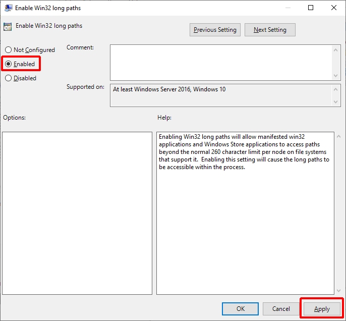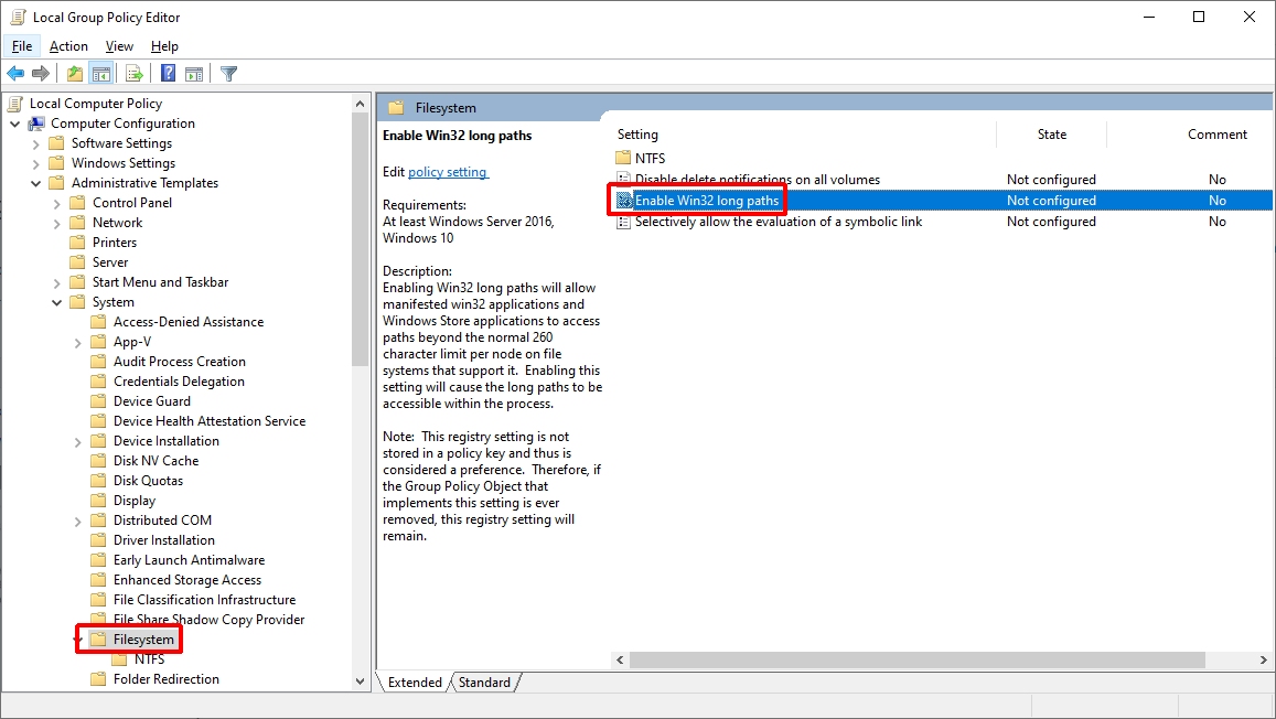 CAST highly recommends that Win32 long paths is enabled on the Node on which the .NET analysis will be run: the extracted package dependencies are stored inside a folder called “nugetPck” which is located in the Deployment folder. Depending on where the Deployment folder is located, the path to the extracted package dependencies may exceed the default 260 character length, which would cause the analyzer to fail to access the dependencies during an analysis. To enable long paths, use the Local Group Policy Editor (gpedit) on the node and drill down to: