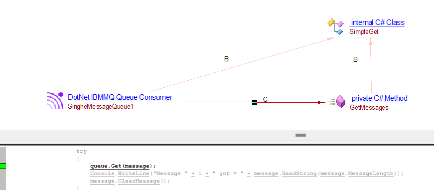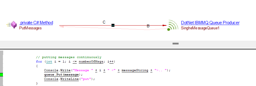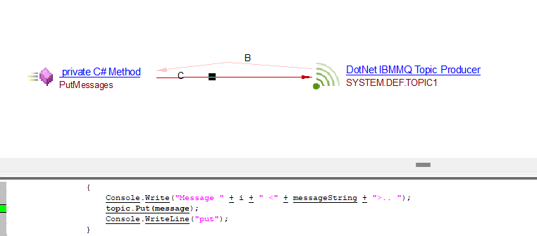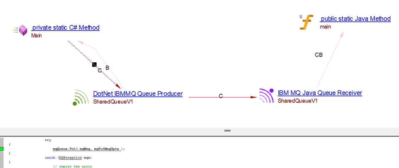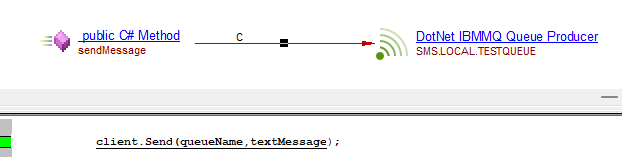 | callLink | callLink between the caller C# method and the DotNet IBMMQ Queue Producer or DotNet IBMMQ Topic Producer objects | Producer API’s support by IBMMQ : IBM.WMQ.MQQueue.Put IBM.WMQ.MQDestination.Put IBM.WMQ.MQQueue.PutForwardMessage IBM.XMS.IMessageConsumer.Receive IBM.XMS.IMessageConsumer.ReceiveNoWait |
