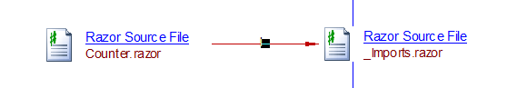 A Blazor component will use all the namespaces referenced in the _Imports.razor files in its hierarchical tree. The analyzer will create an includeLink from the component file to the import file: