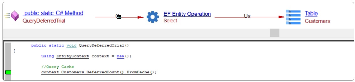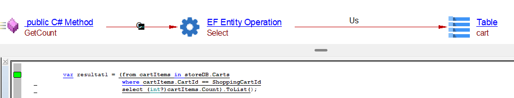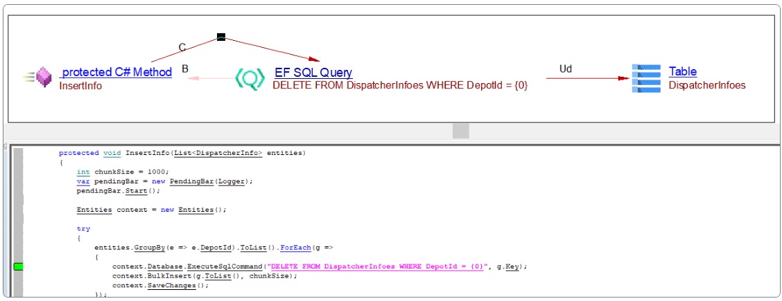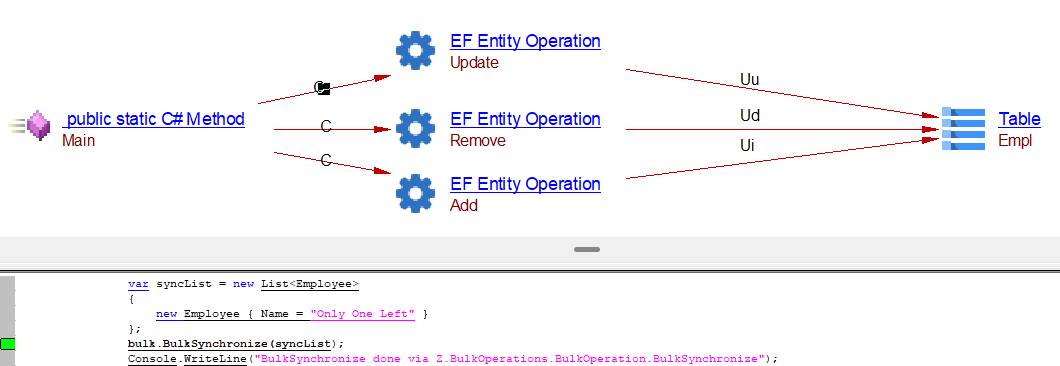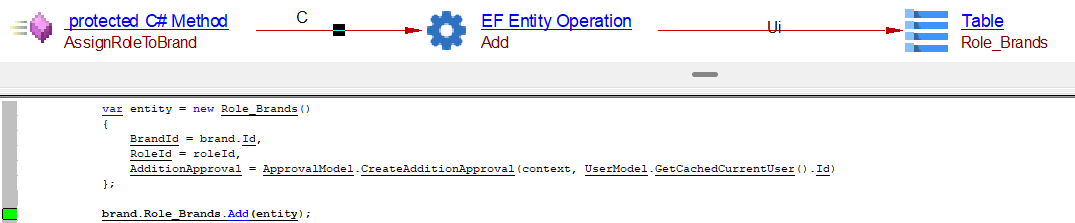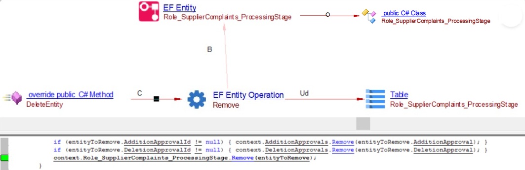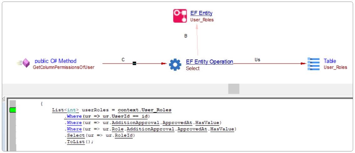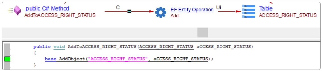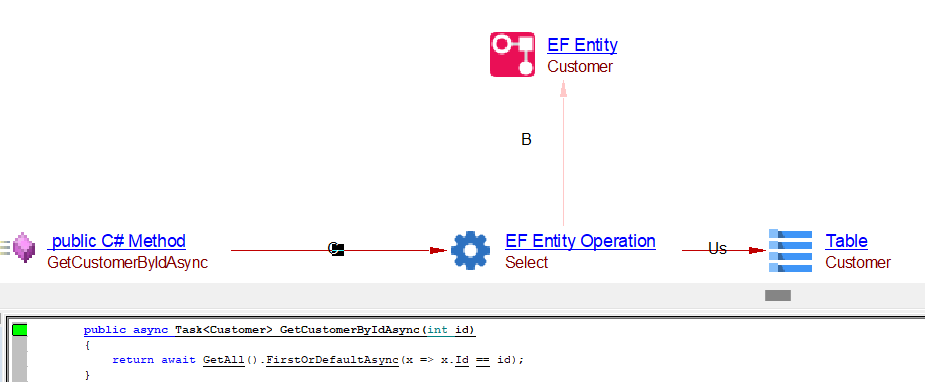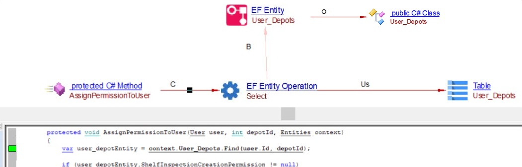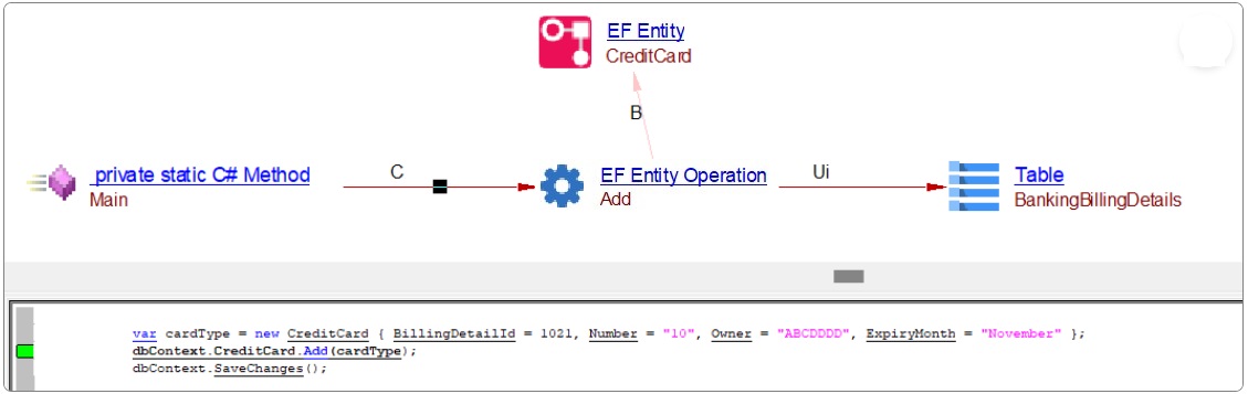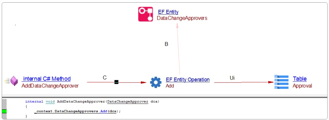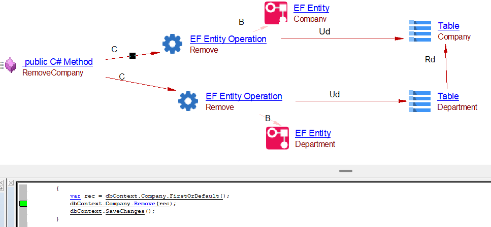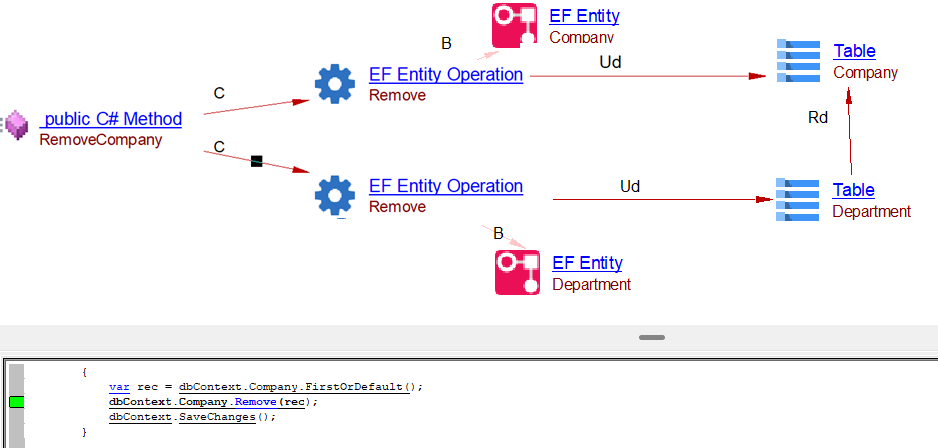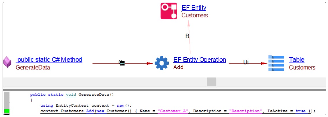 - “call” links from C# methods using Entity Framework operations to Entity framework operation objects