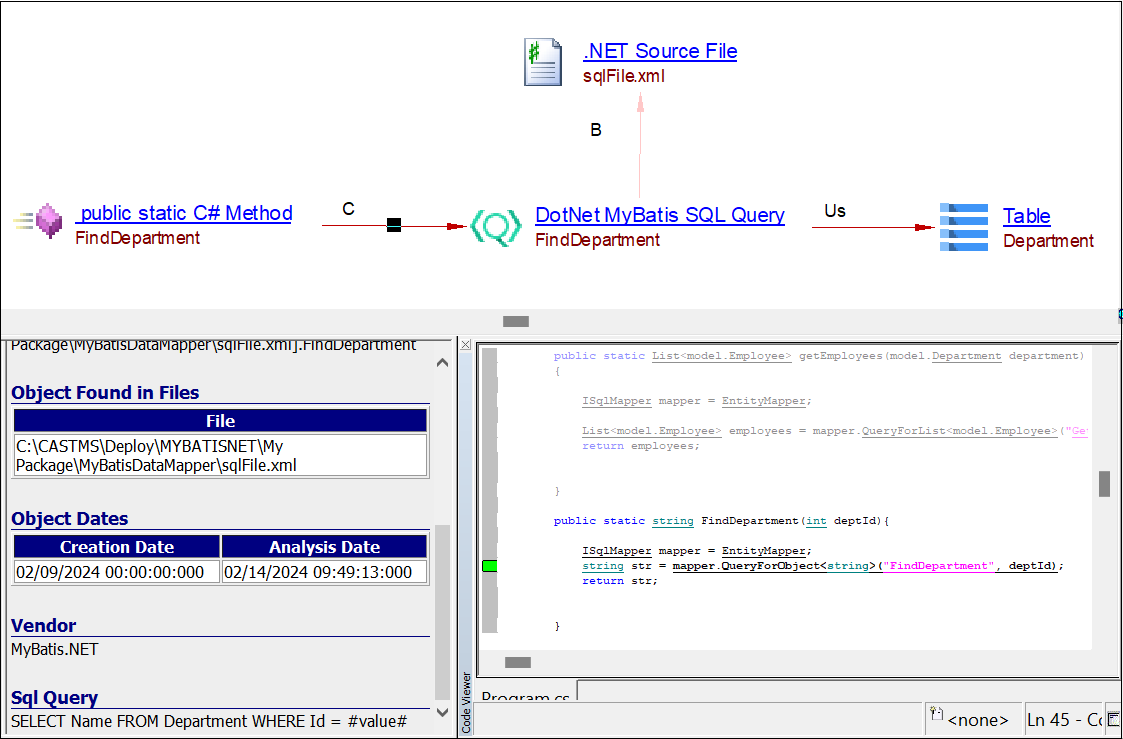 | DotNet MyBatis SQL Query | An object is created for each native SQL query found in .Net project and resolved in a method call/xml file | |