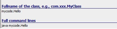 Below is an example of both ways of invoking the same Java program mycode.Hello: