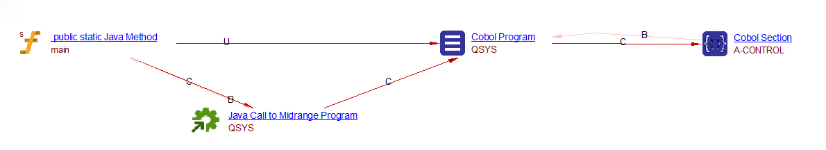 In the example below the call to the the cobol program QSYS is represented by a Java Call to Midrange Program object of the same name.