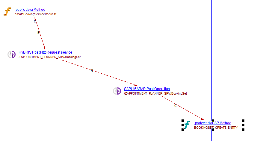 Below is an example of what is obtained after an analysis. The “Hybris Post Http Request service” has been created by the extension with the call link from the java method to the request service. The part on the right is created by the ABAP analyzer, and the link between the Hybris object and the ABAP operation is created by the web service linker: