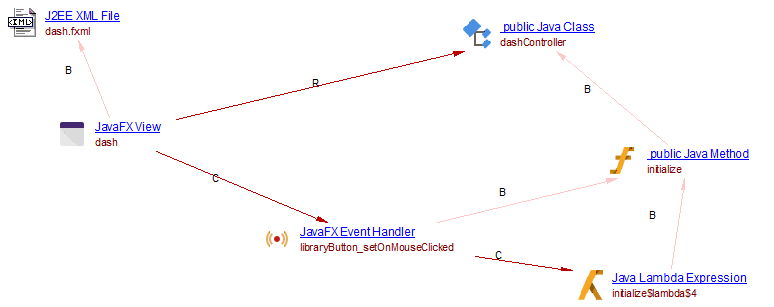 - Creates links from JavaFX Application objects to handlers or java “start” methods present in the application class, and links from the handlers to the Java Lambda expressions when such a lambda exists at the same position.