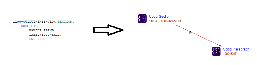 A referLink will be added from Cobol Section objects to Cobol Program objects when the EXEC CICS HAND ABEND PROGRAM statement is used: