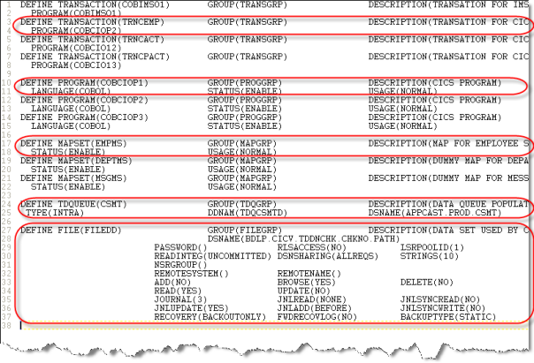 This resource definition can be delivered via a copy (into an ASCII flat file) of the script used to define the CICS environment or by using a JCL in order to extract this information from CICS. The following JCL is shown as an example. If you want to use it, then you have to configure it according to the norms used in the execution environment and then you must specify the lists or the groups of CICS objects to collect (please note that you cannot specify a list and a group on the same command). The application owners and/or CICS administrators are best placed to help you retrieve the information you need.