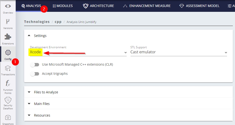 For each C/C++ Technology Analysis Unit created for an Xcode project discovered by CAST, the following options should be set as shown below: