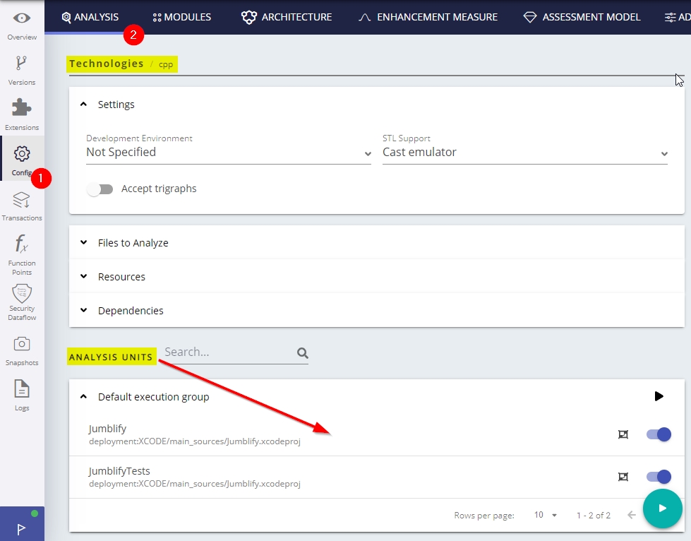 For each C/C++ Technology Analysis Unit created for an Xcode project discovered by CAST, the following options should be set as shown below:
