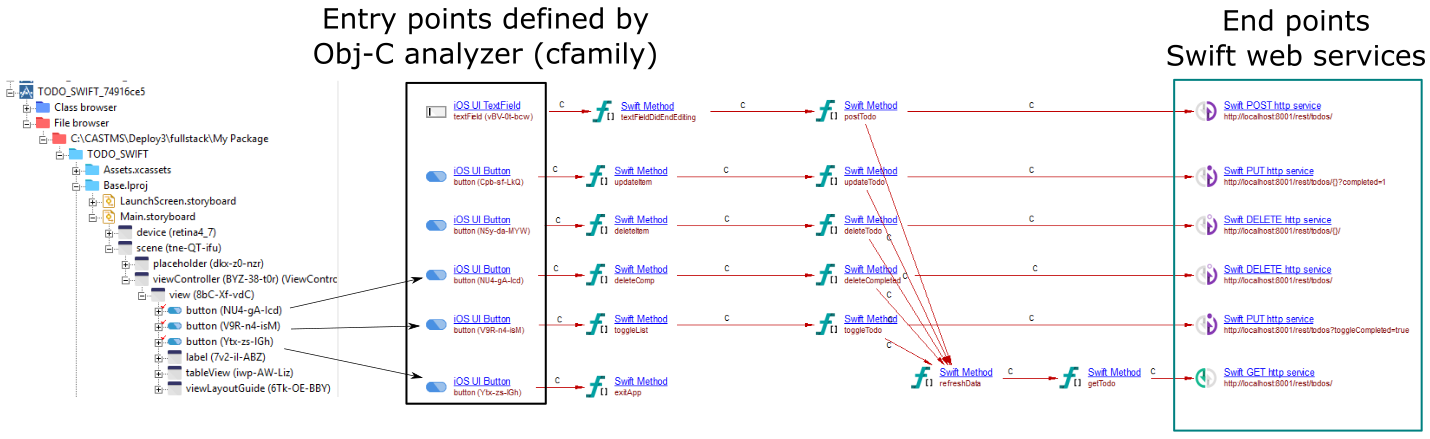 The (call) links from Swift objects (functions, methods, …) to Swift Web Service objects will be created by the analyzer as well. Similar to other analyzers, the responsible of further linking Services and Operations (possible inter-technology) is the dependency extension com.castsoftware.wbslinker . A picture of a simple call-graph including StoryBoard objects as entry points and Web Services as end points is shown in the following section.