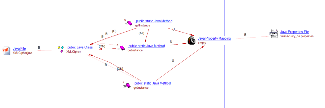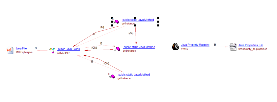 | Link to properties element | Probably a log message | IGNORE | A log message is a dead end in transaction analysis and here we typically have an insertion of the property value in a log message. Yes, the link toward the “property” is real but as it is inserted in a log message it has no real value as a link. Moreover if we validate this link we create a risk : if an incorrect analysis is done of the content of the “property” then there is a risk of creating a false transaction. We choose the safe choice of ignoring these links which has more value in the global analysis of an application. |