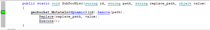 | Update | 2.x | Couchbase.CouchbaseBucket.Replace Couchbase.MemcachedBucket.Replace Couchbase.Core.IBucket.Replace Couchbase.CouchbaseBucket.Upsert Couchbase.MemcachedBucket.Upsert Couchbase.Core.IBucket.Upsert Couchbase.CouchbaseBucket.Append Couchbase.MemcachedBucket.Append Couchbase.Core.IBucket.Append Couchbase.CouchbaseBucket.Prepend Couchbase.MemcachedBucket.Prepend Couchbase.Core.IBucket.Prepend Couchbase.CouchbaseBucket.Increment Couchbase.MemcachedBucket.Increment Couchbase.Core.IBucket.Increment Couchbase.CouchbaseBucket.Decrement Couchbase.MemcachedBucket.Decrement Couchbase.Core.IBucket.Decrement Couchbase.CouchbaseBucket.MutateIn Couchbase.MemcachedBucket.MutateIn Couchbase.Core.IBucket.MutateIn Couchbase.CouchbaseBucket.ReplaceAsync Couchbase.MemcachedBucket.ReplaceAsync Couchbase.Core.IBucket.ReplaceAsync Couchbase.CouchbaseBucket.UpsertAsync Couchbase.MemcachedBucket.UpsertAsync Couchbase.Core.IBucket.UpsertAsync Couchbase.CouchbaseBucket.AppendAsync Couchbase.MemcachedBucket.AppendAsync Couchbase.Core.IBucket.AppendAsync Couchbase.CouchbaseBucket.PrependAsync Couchbase.MemcachedBucket.PrependAsync Couchbase.Core.IBucket.PrependAsync Couchbase.CouchbaseBucket.IncrementAsync Couchbase.MemcachedBucket.IncrementAsync Couchbase.Core.IBucket.IncrementAsync Couchbase.CouchbaseBucket.DecrementAsync Couchbase.MemcachedBucket.DecrementAsync Couchbase.Core.IBucket.DecrementAsync |