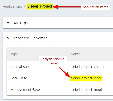 This opening tag is required and defines the Vanilla application as created in CAST Console. CAST highly recommends that you input the Analysis schema name where possible as this ensures that the Siebel extension does not need to perform a lookup based on the Application name, but you can use the Application name instead if necessary. Both are highlighted in the screenshot below and can be found in the CAST Console Admin Center.