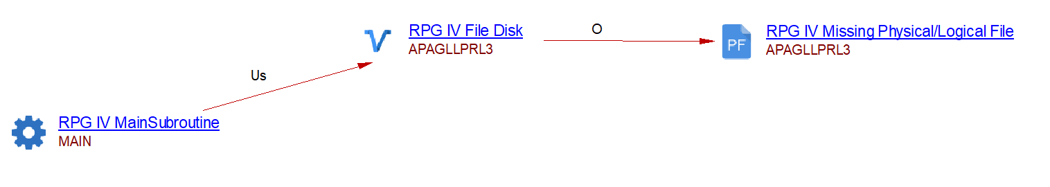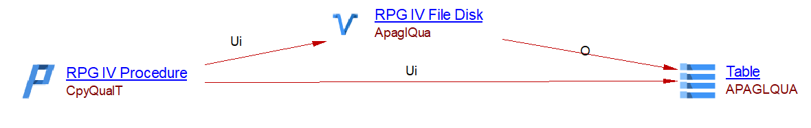 The RPG IV Missing Physical/Logical File “APAGLQUA” object is created at analyzer level because com.castsoftware.rpg cannot know at that point that a Table or View exists resulting from a com.castsoftware.sqlanalyser analysis. At application level, a matching protocol is used to link “RPG IV File Disk” to the “Table” and delete the RPG IV Missing Physical/Logical File only if a match has been found.