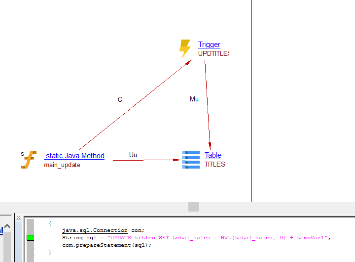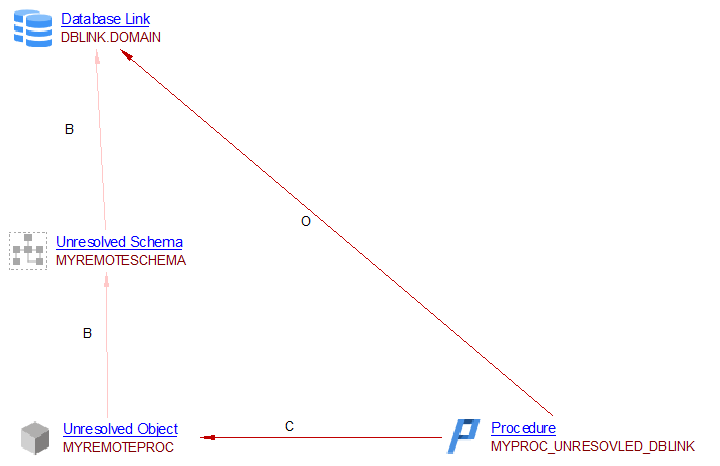 Unresolved Schema | When objects accessed via a database link in a DML statement are not resolved, they are missing from analysis result, an Unresolved table or Unresolved Object is created, in a Unresolved Schema. When the object is more “table like”, we add an Unresolved Table. When the object is more “procedure / function like” we add an Unresolved Object. In the database link access objects are prefixed with schema name, that schema will belongs to the Database Link object, Unresolved Table / Object will belongs to Unresolved Schema. See example SQL Analyzer - How object identity is determined. |