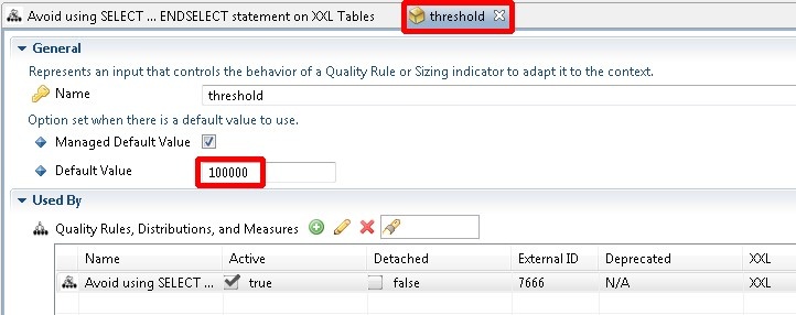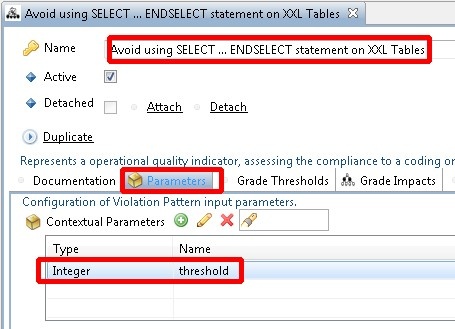 Each XXL/XXS rule has its own specific Contextual Parameter that defines the threshold. For example, the Quality Rule 7666 “Avoid using SELECT … ENDSELECT statement on XXL Tables” uses a Contextual Parameter as follows: