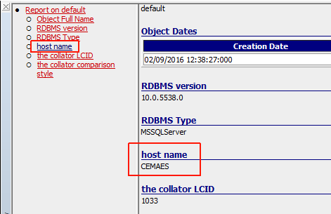 - Select Properties to update the Property window. The “host” name highlighted below can be used to define the “Server” node in the .SQLTABLESIZE file: