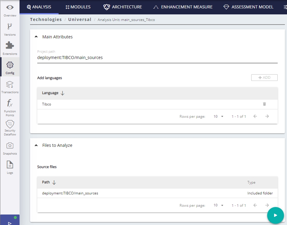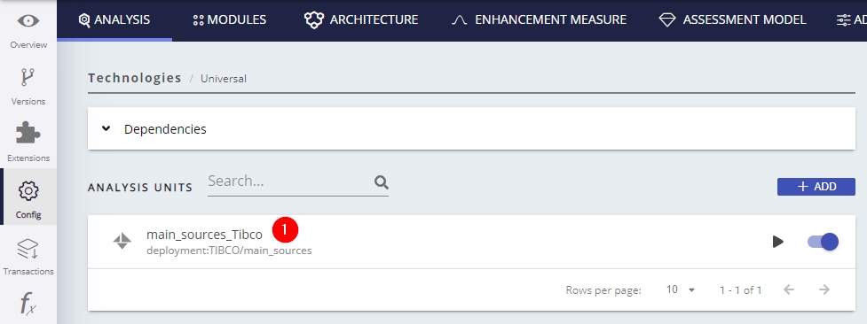 AIP Console exposes the technology configuration options once a version has been accepted/imported, or an analysis has been run. Click Universal Technology (3) in the Config (1) > Analysis (2) tab to display the available options for your TIBCO source code: