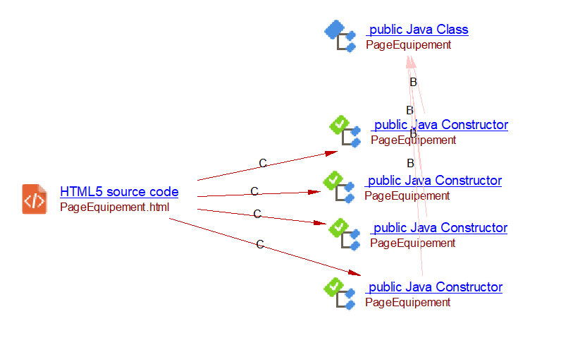 Java classes can contain multiple Java Constructors. In this situation, the extension will produce a callLink from the HTML5 source code object to each of the explicitly defined Java Constructors objects as follows: