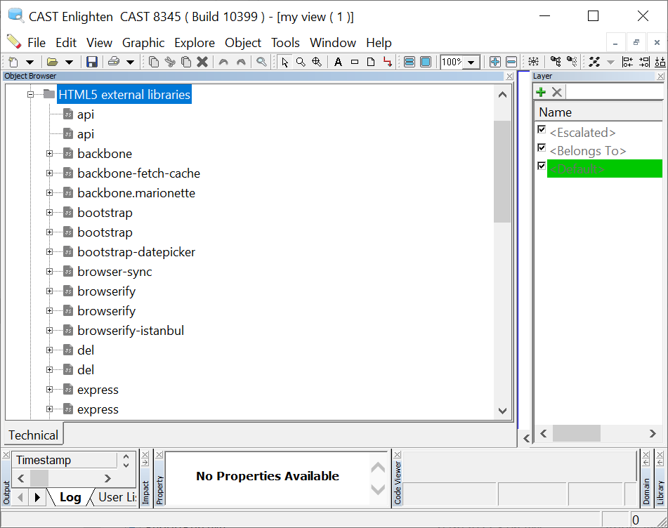 In HTML5/Javascript ≥ 2.1.29, the analyzer supports handlebars files https://handlebarsjs.com/ . This templating can be used in any kind of file type (javascript, HTML, text, or any other type). A detection process is carried out by the HTML5 extension to identify which kind of file represents the file. This is why a specific metamodel type “Handlebars Source Code” is created, and a HTML or Javascript fragment is created under this handlebars source code: