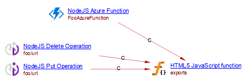 Whenever an Azure Function is found in the analyzed source code, an Azure Function object is created with a callLink to the JavaScript handler function. Note that if the handler function is defined in a TypeScript file, this extension will create the Azure Function with a callLink to the TypeScript handler function only if the com.castoftware.typescript extension is used.