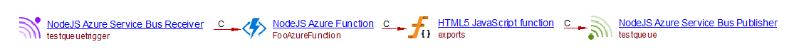 • When the bindings section of the function.json file contains one item of type “serviceBus” with a direction “out”, a Service Bus Publisher is created with a call link from the handler function. The name of the queue is evaluated from the “name” value.