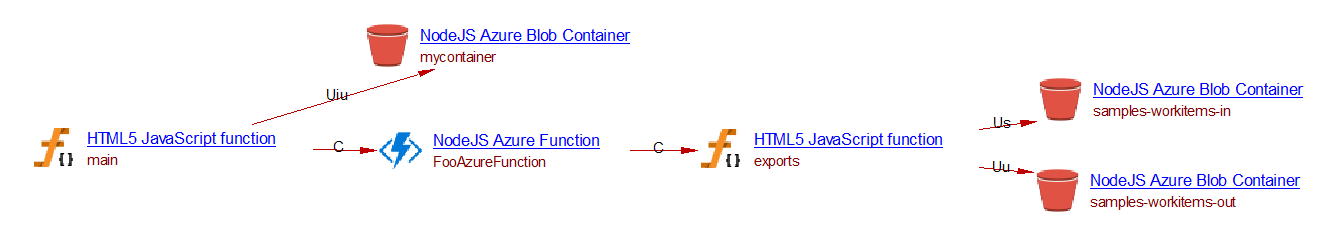 • When the bindings section of the function.json file contains one item of type “blob” with a direction “in” (resp. “out”), a blob container is created with a useSelect (resp. useUpdate) link from the handler function to the blob container. The name of the container is given by the beginning of “path”.