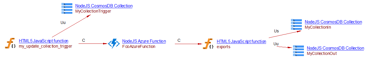 • When the bindings section of the function.json file contains one item of “type” “cosmosDBTrigger”, a property is added to the azure function object. That property (CAST_Azure_Function.cosmosDB_triggers) stores the name of the CosmosDB database and collection which are evaluated from “databaseName” and “collectionName”. The Web Services Linker extension will then create a link to the Azure Function from all callers calling with a useInsert or useUpdate link a cosmosdb collection matching the collection name and database. The callers may come from any CAST extension.