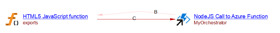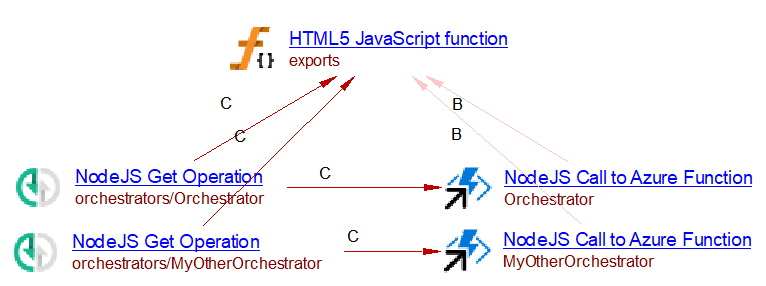 The startNew method from the “durable-function” client allow the client function to call an orchestrator function.  The callActivity method from the “durable-function” package allows calling an activity function. Whenever one of these method calls is found in a JavaScript source code, a call to Azure Function object is created. The name of the object is evaluated from the first argument of the call. If an Azure Function object with the same name exists, a call link from the call to the Azure Function to that matching Azure Function is created.