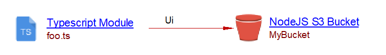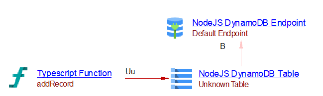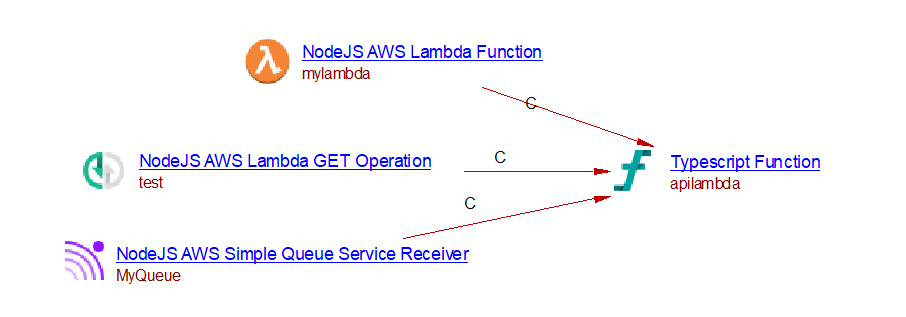 Let us consider a source code defining a lambda function that has two triggers: an SQS queue and an API Gateway. The lambda function has a nodejs runtime and the handler function is given by the handler function fullname. If the lambda function is deployed using a supported deployment framework (such as CloudFormation), the analysis will create a lambda function, an SQS receiver, and an API Gateway objects. Each of these objects has a runtime property (nodejs) and a handler property with the function fullname. If the current extension finds a TypeScript function matching the handler fullname a link to that function will be added from the lambda function, the SQS queue, and the API Gateway objects.