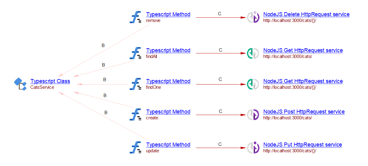 In this example, five service objects are created, and five ‘call’ links are also added between these objects and Typescript methods corresponding.
